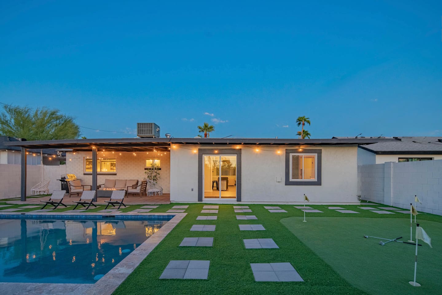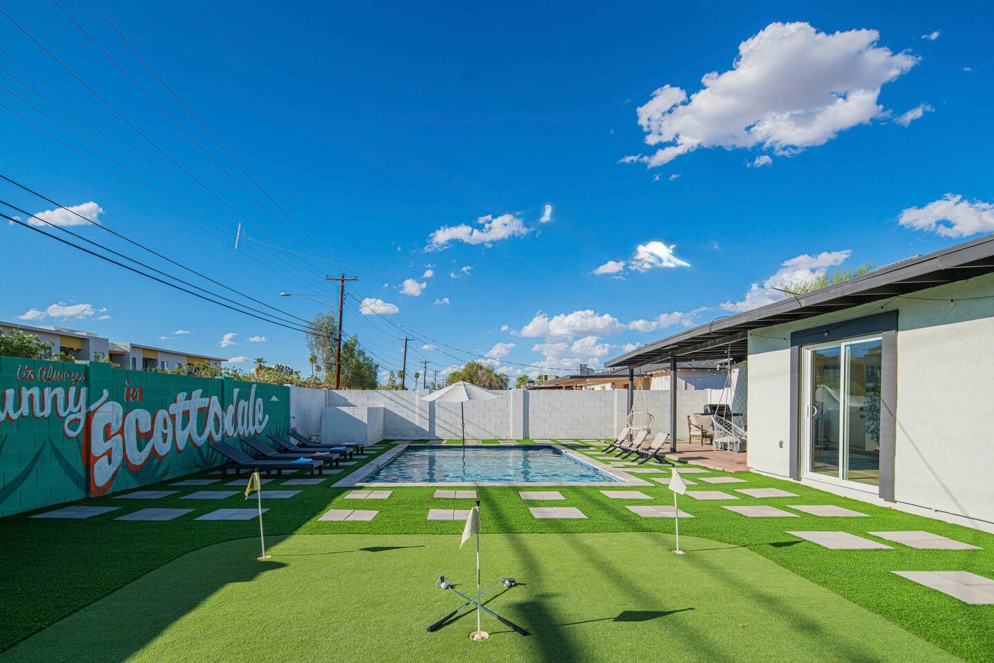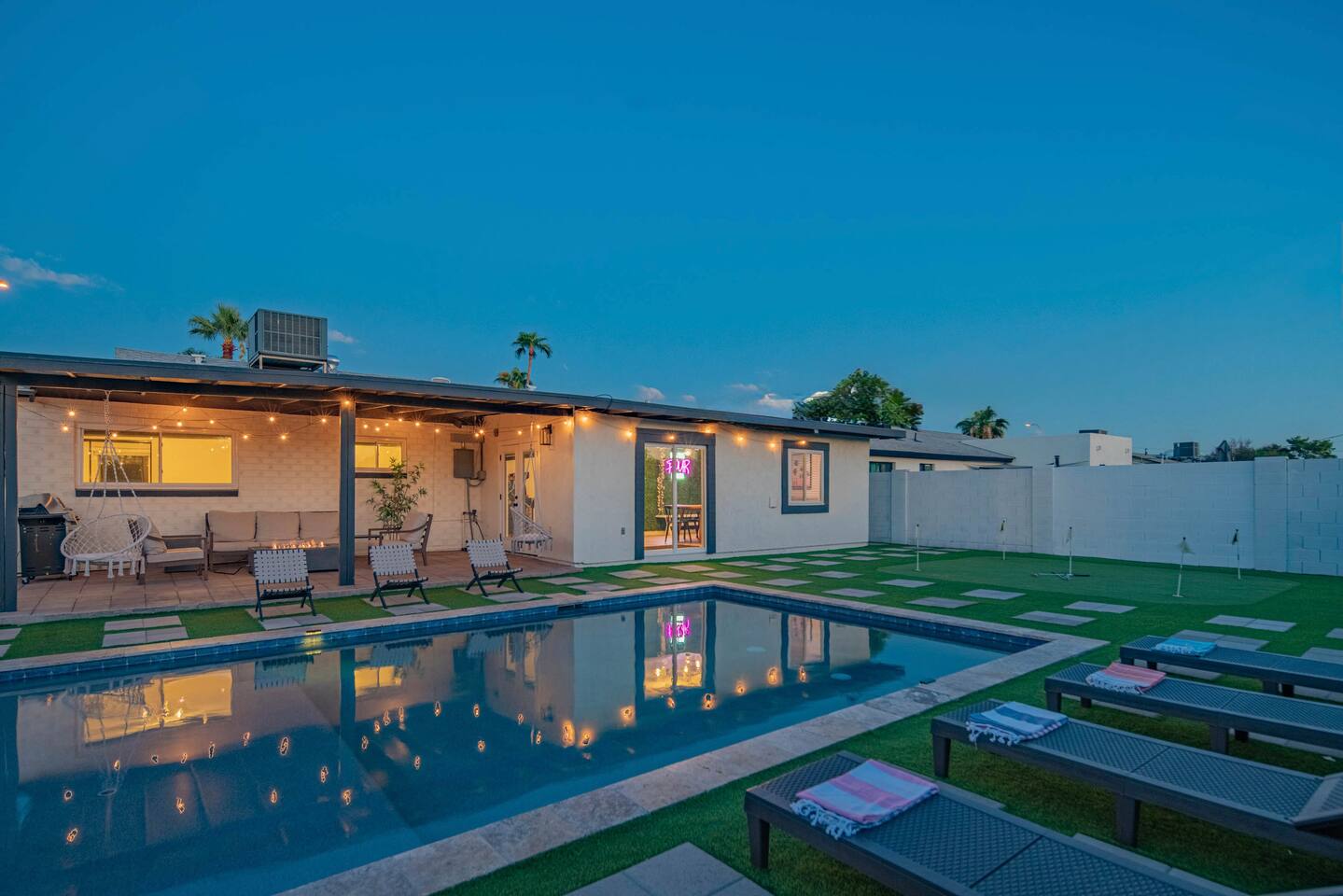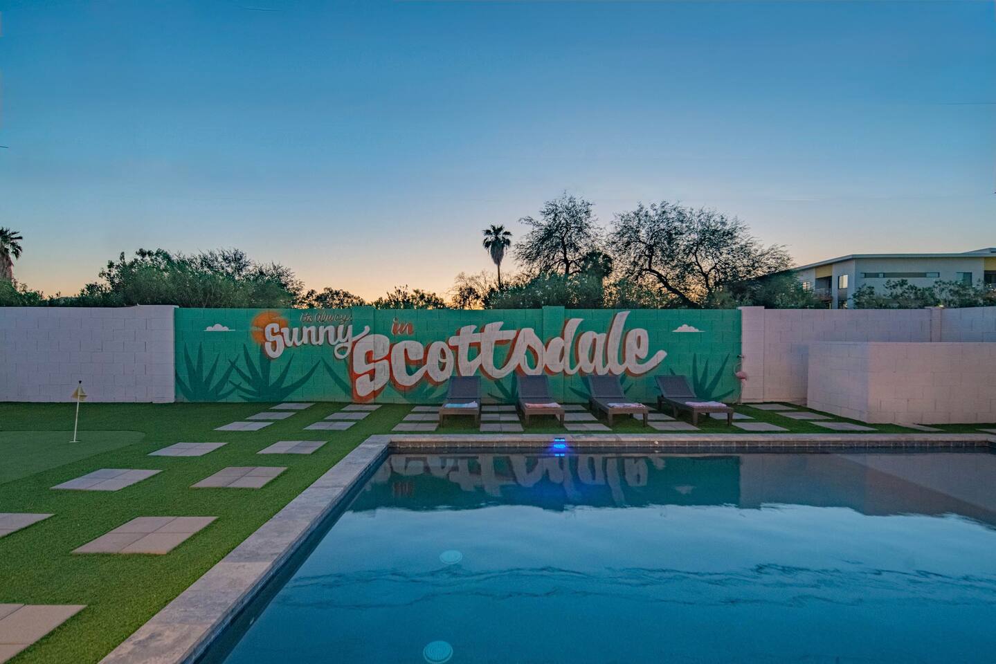 ☀️ Sunny Escape in the Heart of Scottsdale! 🏡 This stylish 3BR, 2BA home sleeps 10 and features a resort-style backyard with a pool, large putting green, swing chairs, yard games, and a grill. Inside, enjoy an open layout, fully stocked kitchen, a fun photo wall, Keurig coffee bar, and in-unit laundry. Located in a quiet, family-friendly neighborhood just minutes from Old Town, it’s perfect for families, groups, and pet lovers ready to soak up the Scottsdale sun.
