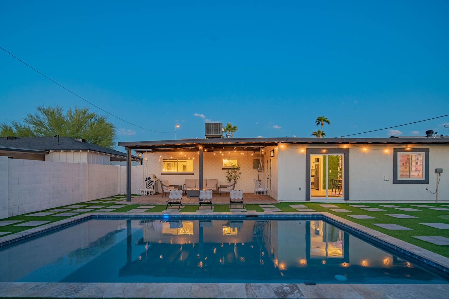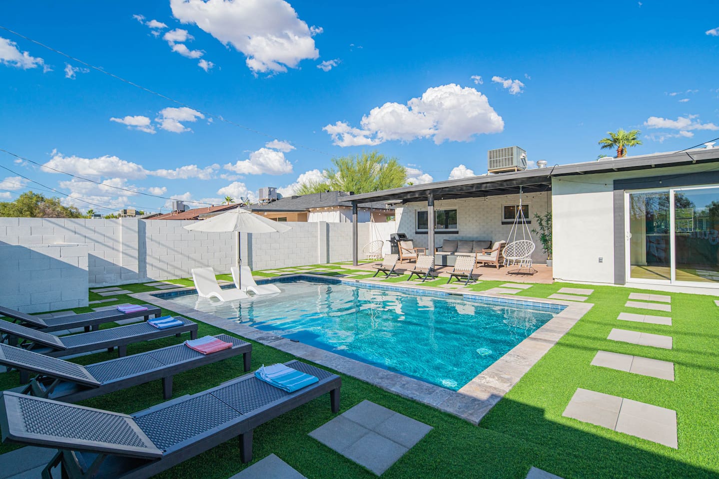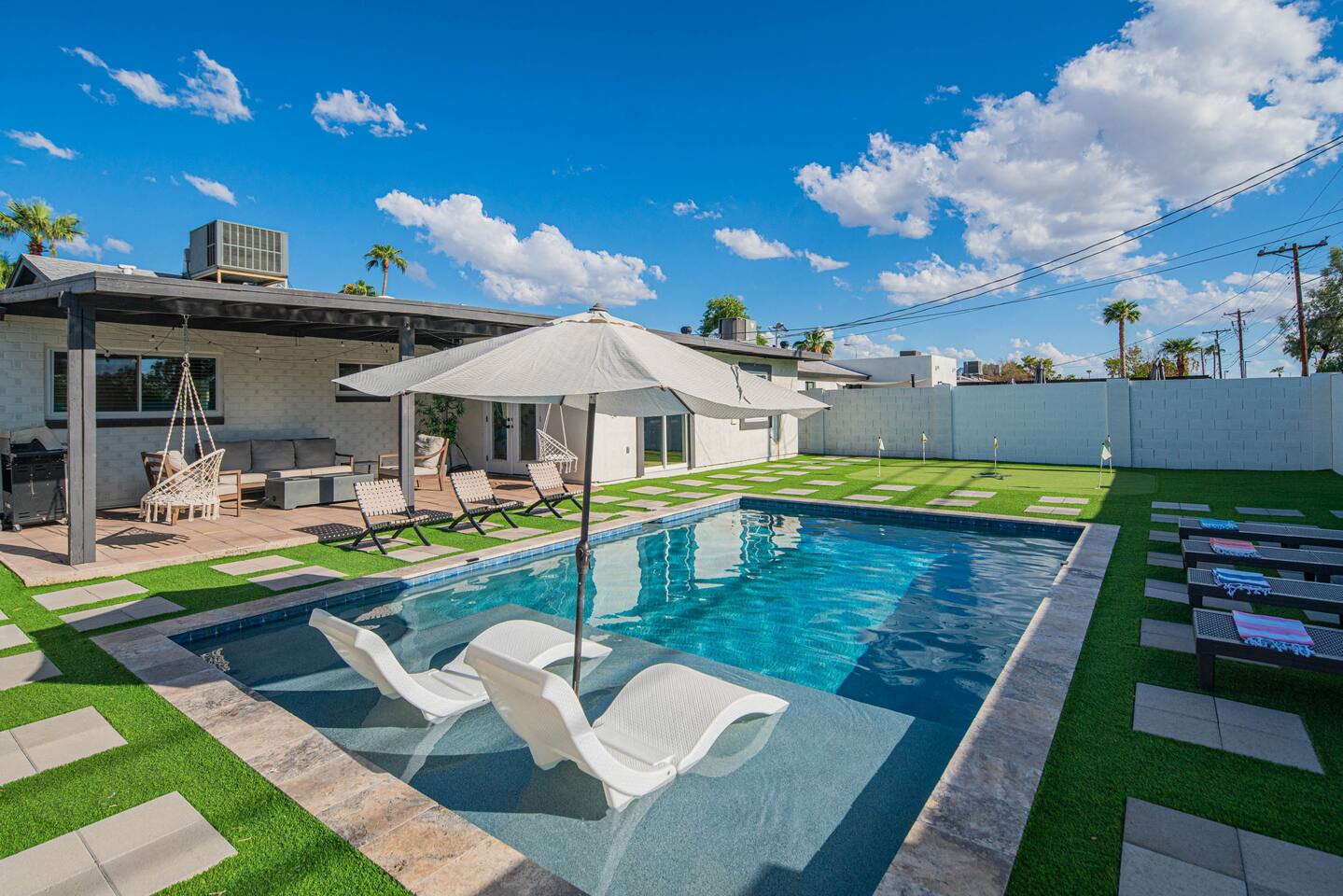☀️ Sunny Escape in the Heart of Scottsdale! 🏡 This stylish 3BR, 2BA home sleeps 10 and features a resort-style backyard with a pool, large putting green, swing chairs, yard games, and a grill. Inside, enjoy an open layout, fully stocked kitchen, a fun photo wall, Keurig coffee bar, and in-unit laundry. Located in a quiet, family-friendly neighborhood just minutes from Old Town, it’s perfect for families, groups, and pet lovers ready to soak up the Scottsdale sun.