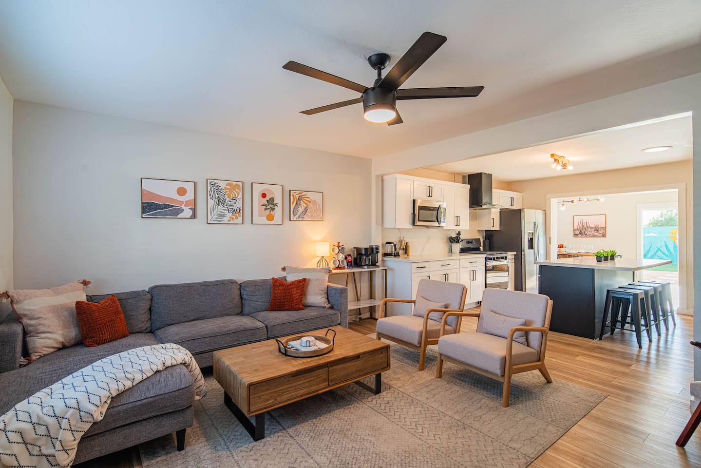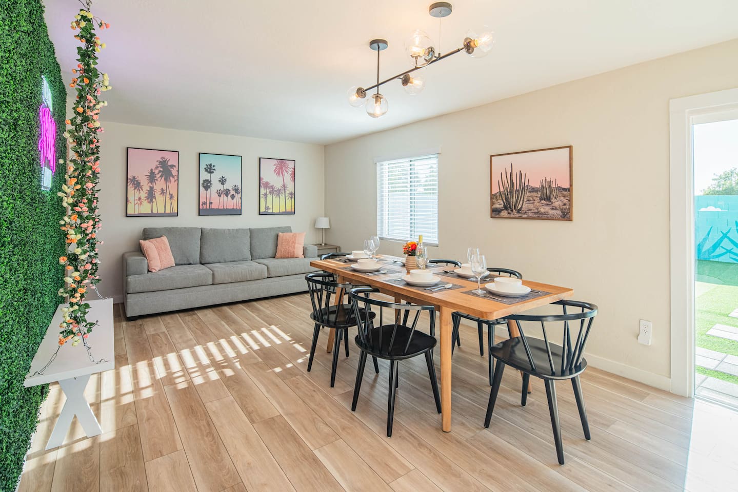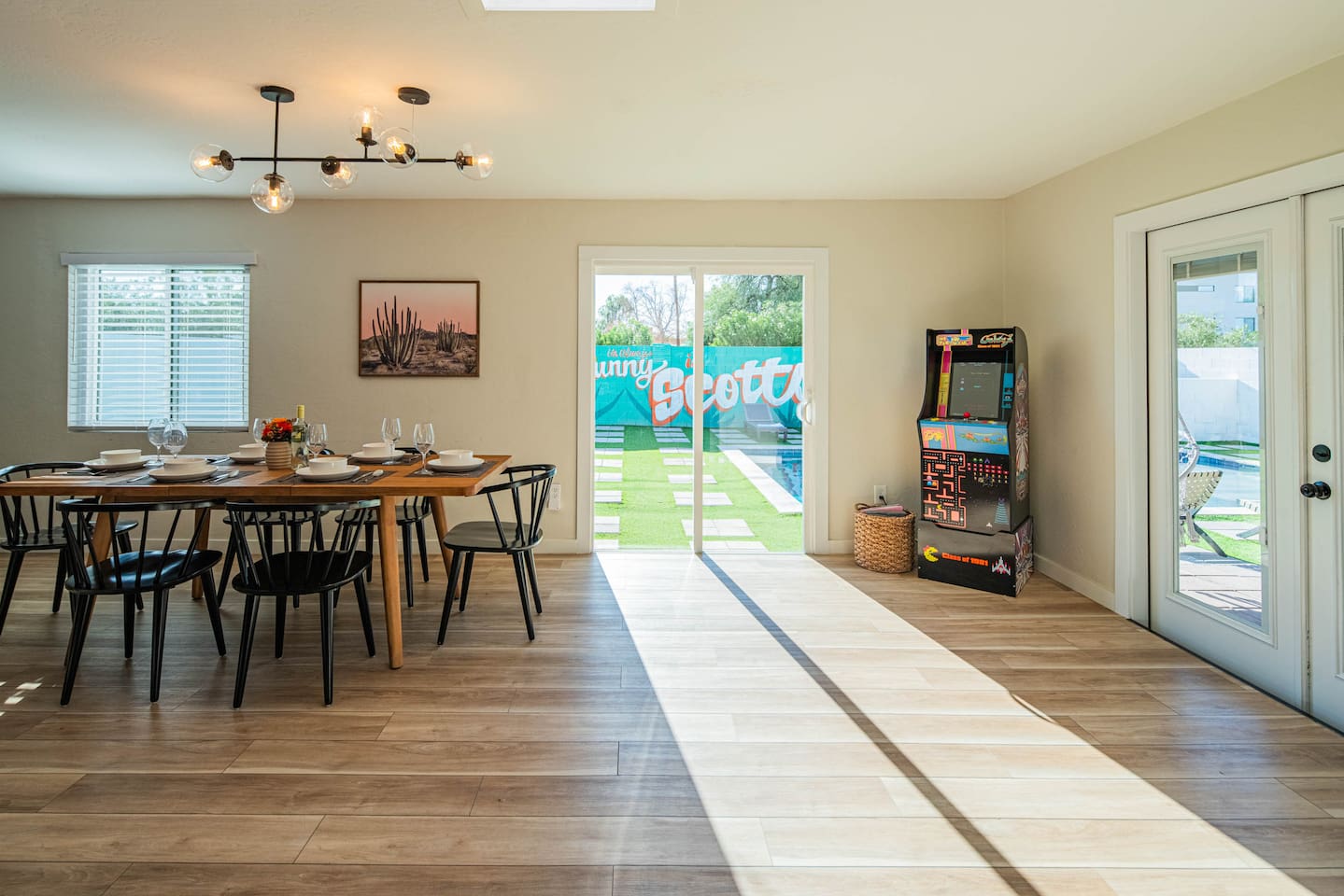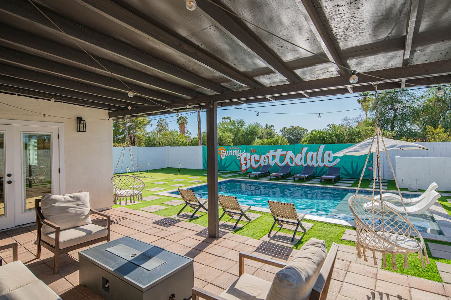 ☀️ Sunny Escape in the Heart of Scottsdale! 🏡 This stylish 3BR, 2BA home sleeps 10 and features a resort-style backyard with a pool, large putting green, swing chairs, yard games, and a grill. Inside, enjoy an open layout, fully stocked kitchen, a fun photo wall, Keurig coffee bar, and in-unit laundry. Located in a quiet, family-friendly neighborhood just minutes from Old Town, it’s perfect for families, groups, and pet lovers ready to soak up the Scottsdale sun.