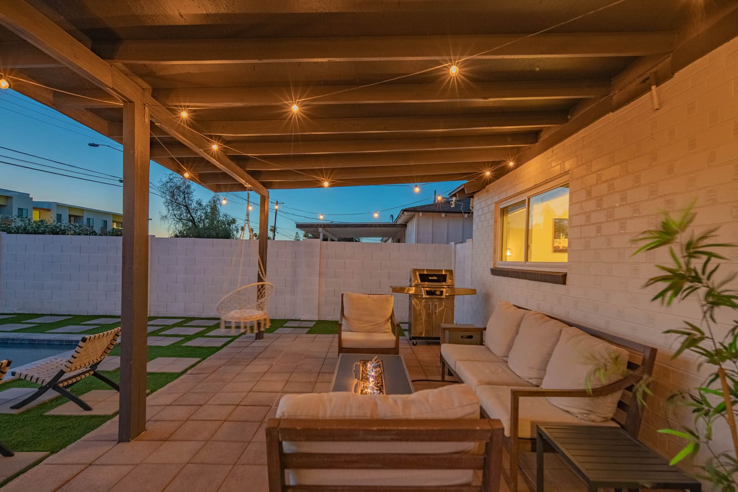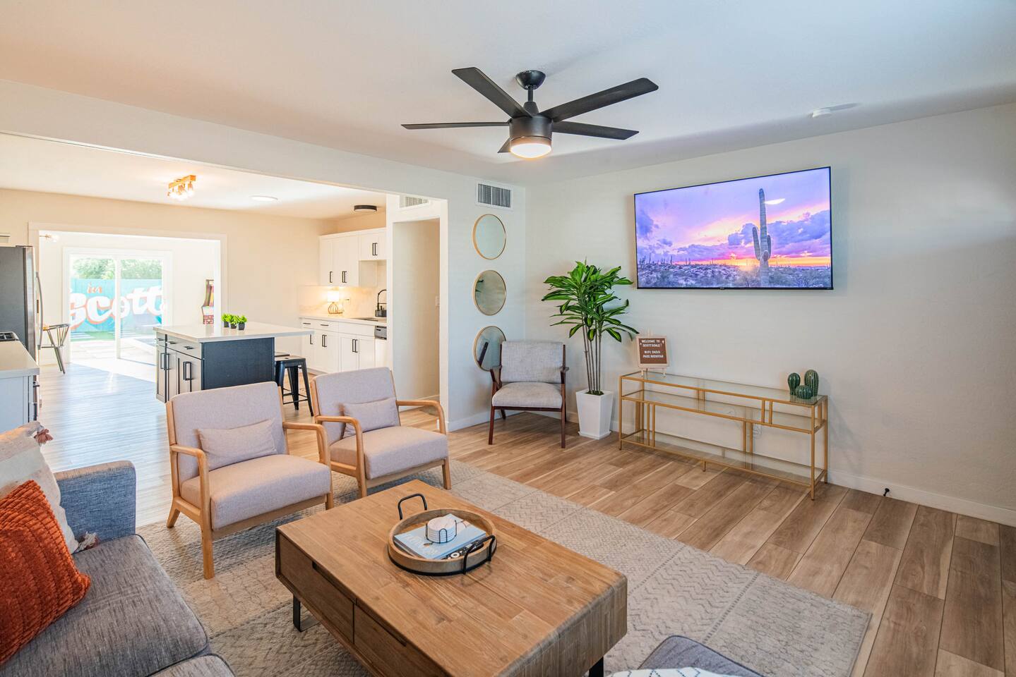 ☆ WHAT GUESTS LOVE ABOUT STAYING HERE ☆ ➢ The amazing backyard space including: Pool, large putting green, and a cozy patio with a fireplace & grill ➢ Sunset view in the backyard ➢ Family friendly - quiet & safe neighborhood ➢ Prime Scottsdale location near Old Town & more ➢ Modern & open living concept ➢ Bedroom design and comfort ➢ Fun neon sign for pictures ➢ Perfect spot for friends or family to get together ➢ Fully equipped kitchen ➢ Coffee: Keurig w/ free grounds & K cups provided ➢ Laundry: In unit washer and dryer (sensitive skin detergent) ➢ Professionally cleaned and sanitized between each and every guest. ➢ Pets allowed for small fee per night ➢ Responsive & caring communication with the host We genuinely hope you have the best experience with us here in Scottsdale! Add my listing in your wishlist by clicking ❤️ for your future reference. ☟Neighborhood description & travel times below the location/map